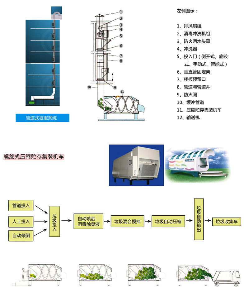 重力式污物收集系统产品采用类变频省电装置,可节省30%用电量。感应式电动气密垃圾投入门设计,卫生、方便、省电。垂直感应电动气密垃圾投入门,小空间也可装设。内置式垃圾压缩装置,垃圾减容,节省空间。隐藏式线路,电线与管路隐藏于库体内,安全、美观。另外,其投入口内设集中罩,垃圾及厨余集中掉落不散乱。同时,投入口设有垃圾车及专用厨余桶。管道式垃圾收集系统从垃圾投入、输送、破碎、除臭、消毒、压缩、贮存、排出等,全程智能化控制,24小时无人管理。改变传统的垃圾处理模式,实现垃圾的全封闭、不落地处理。