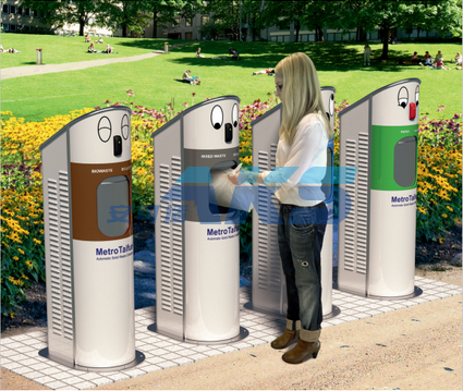 室外垃圾投放口一般设在人流量集中的位置;也可设计在绿化等旁边,满足景观要求。一般做到各用户最远步行30米可达最近的室外投放口。使用者只需打开投放口门,将垃圾投进去,再把门关上即可。投放口下方设有阀门,垃圾会暂时停留在阀门的上方储存,系统定时收集或当垃圾过多触动水平感应器,收集站内的控制中心收到讯号后就会启动系统,并打开阀门排走垃圾。